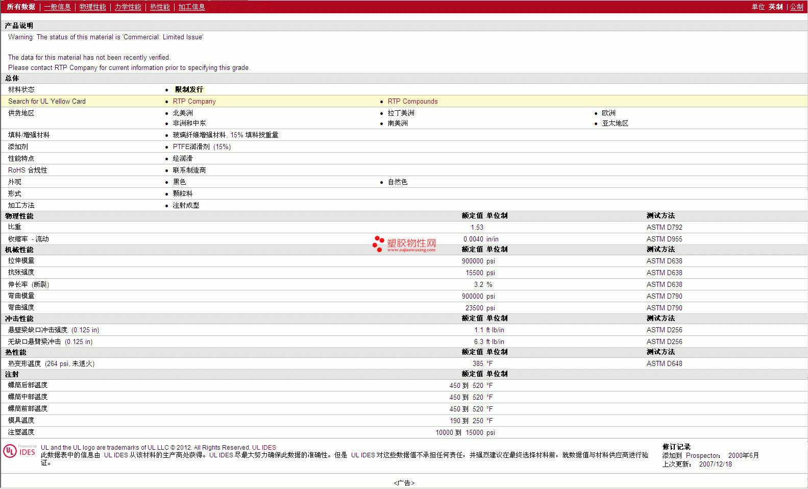 需了解RTP Compounds PTFE 4702 TFE 15 物性表材质证明、ROHS(SGS)报告、物质安全资料表(MSDS)、UL黄卡等可来电咨询:赵先生:13424755533或QQ: 27660005