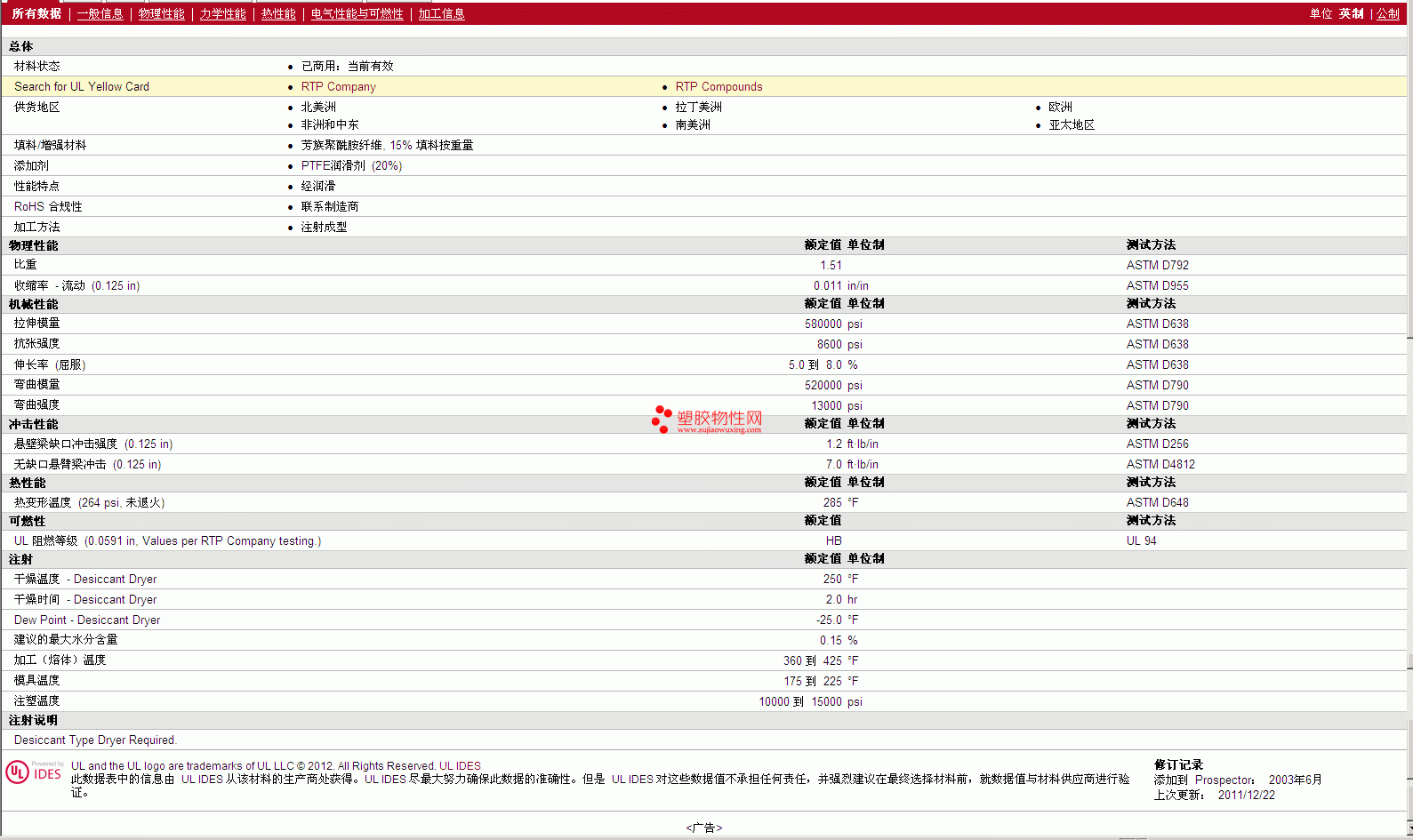 需了解RTP Compounds PTFE 800 AR 15 TFE 20 物性表更多详情,材质证明、ROHS(SGS)报告、物质安全资料表(MSDS)、UL黄卡等,最新行情报价等可来电咨询:赵先生:13424755533或QQ: 27660005