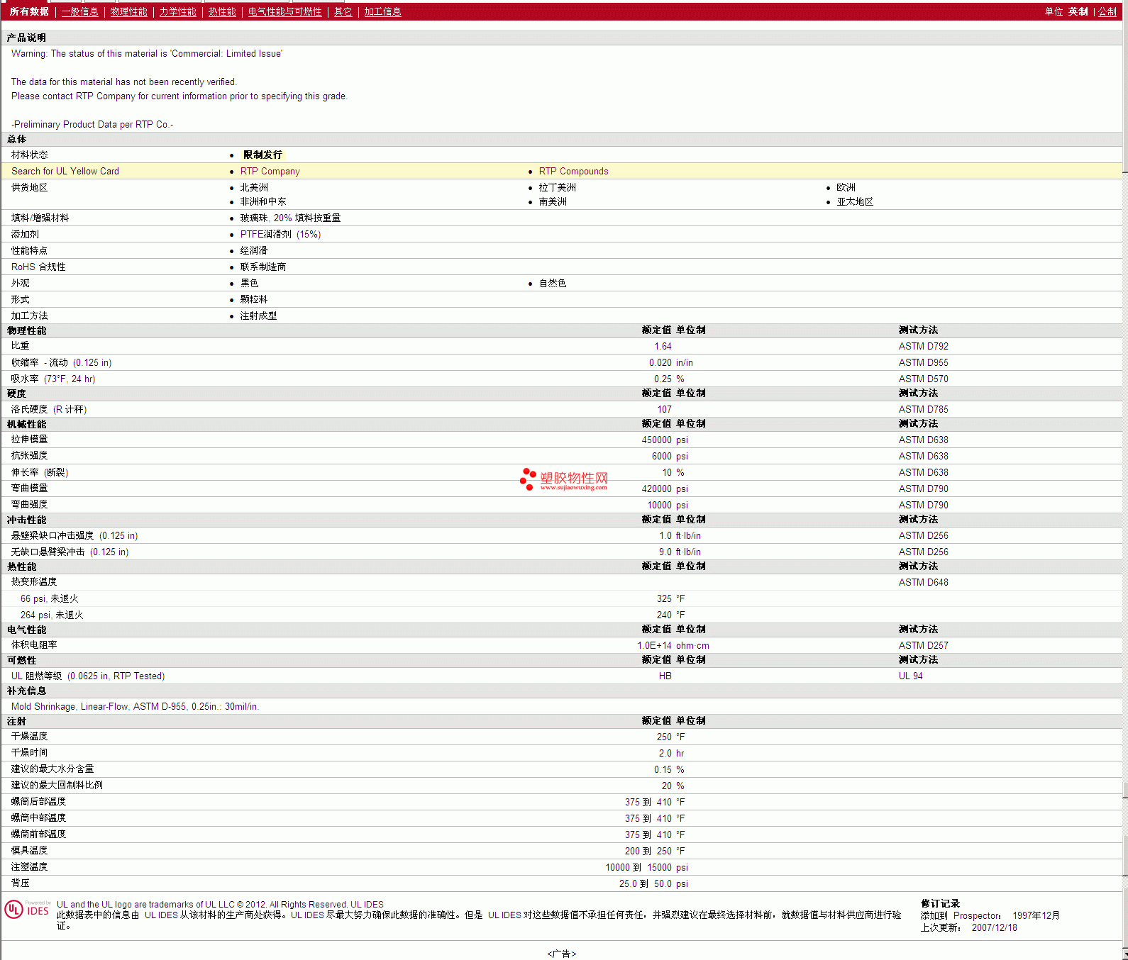 需了解RTP Compounds PTFE 800 GB 20 TFE 15 物性表更多详情,材质证明、ROHS(SGS)报告、物质安全资料表(MSDS)、UL黄卡等,最新行情报价等可来电咨询:赵先生:13424755533或QQ: 27660005