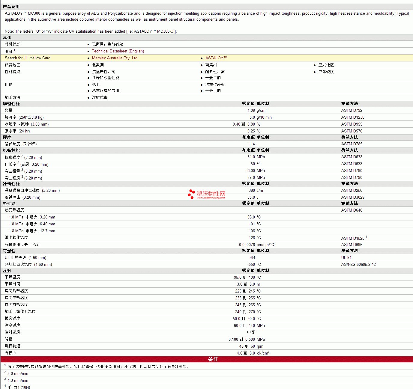 ASTALOY PC/ABS MC300物性表 更多资料见下图