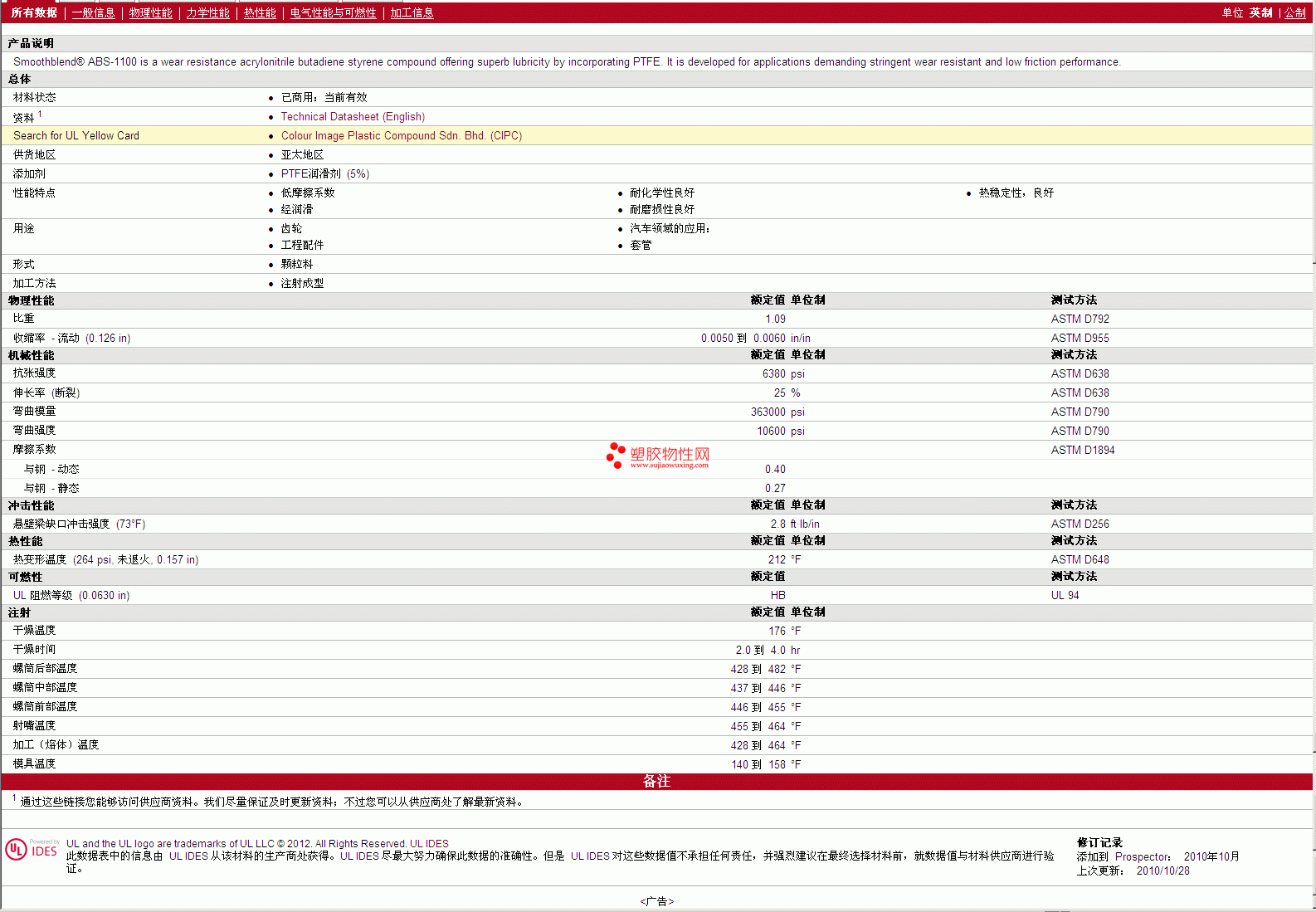 如需了解Smoothblend PTFE ABS-1100 物性表更多详情,ROHS(SGS)报告、物质安全资料表(MSDS)、材质证明、UL黄卡等,最新行情报价等可来电咨询:赵先生:13424755533或QQ: 27660005