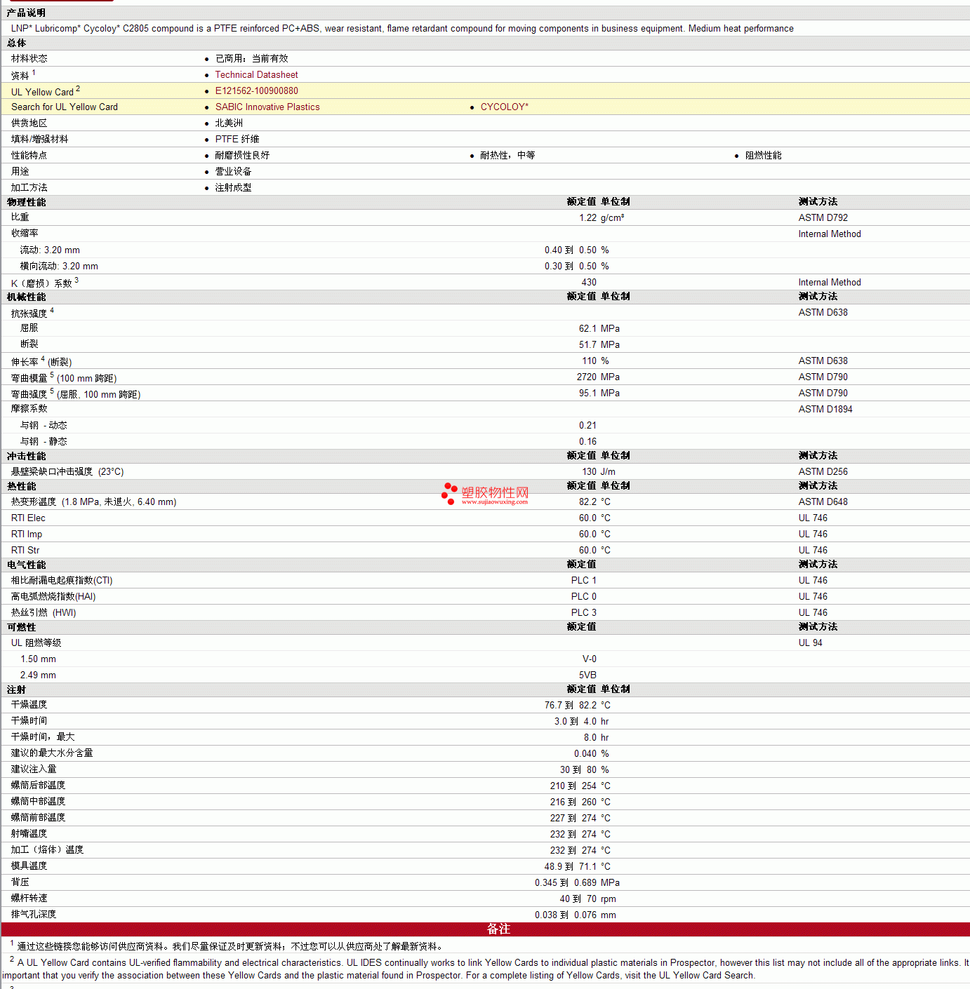 CYCOLOY pc/ABS C2805 Resin物性表 更多资料见下图