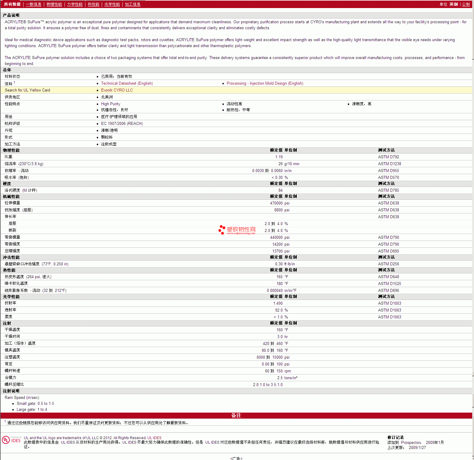 更多 ACRYLITE SuPure PMMA L40 物性表报价,图片、材质证明、UL黄卡、物质安全资料表(MSDS)等可来电咨询赵先生:13424755533或QQ: 27660005