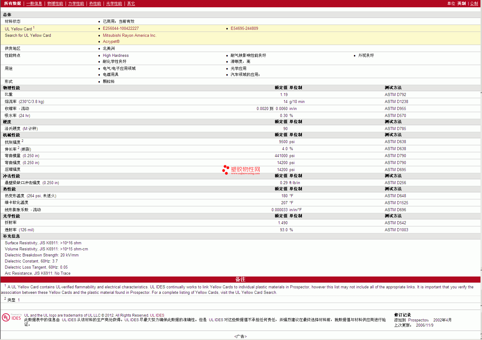 更多Acrypet PMMA MF 物性表报价,图片、材质证明、UL黄卡、物质安全资料表(MSDS)等可来电咨询赵先生:13424755533或QQ: 27660005