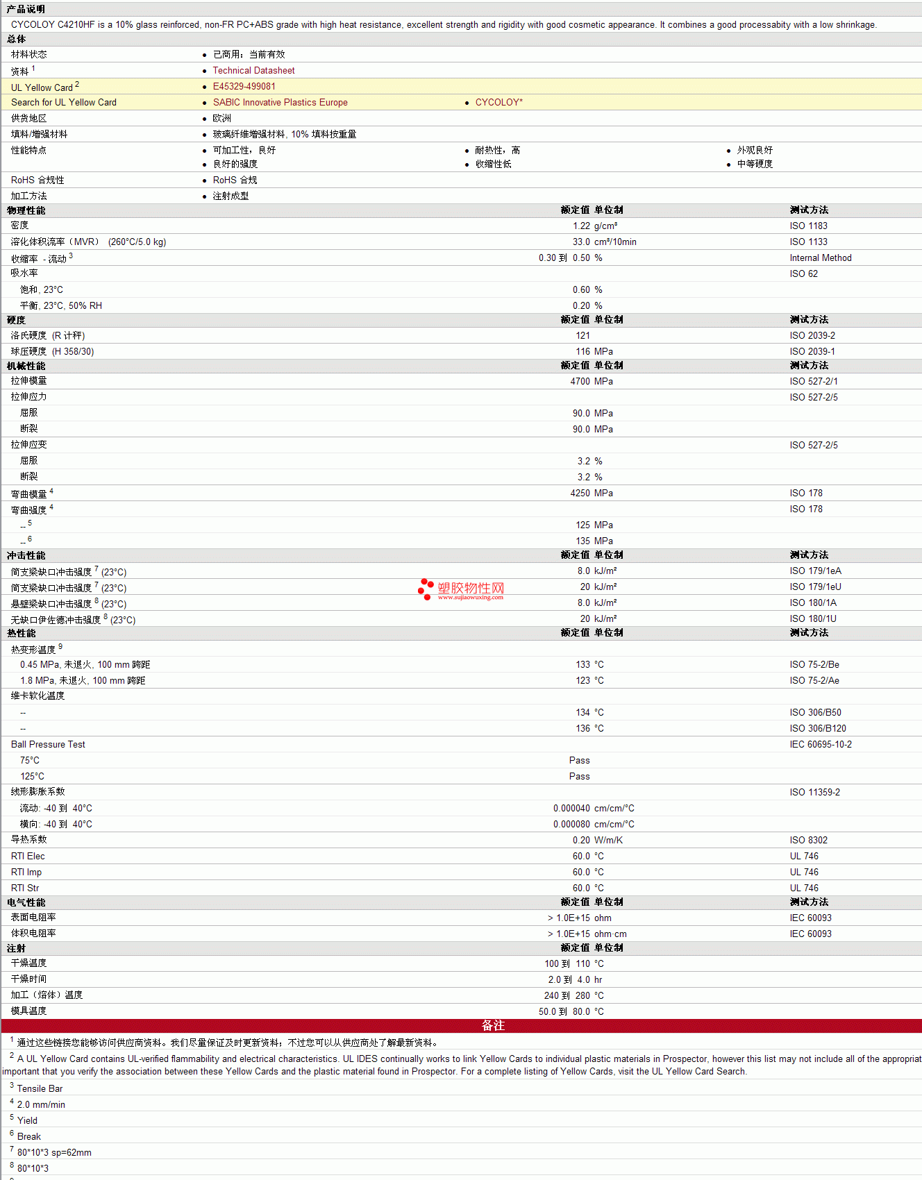 CYCOLOY pc/abs C4210HF Resin物性表更多资料见下图