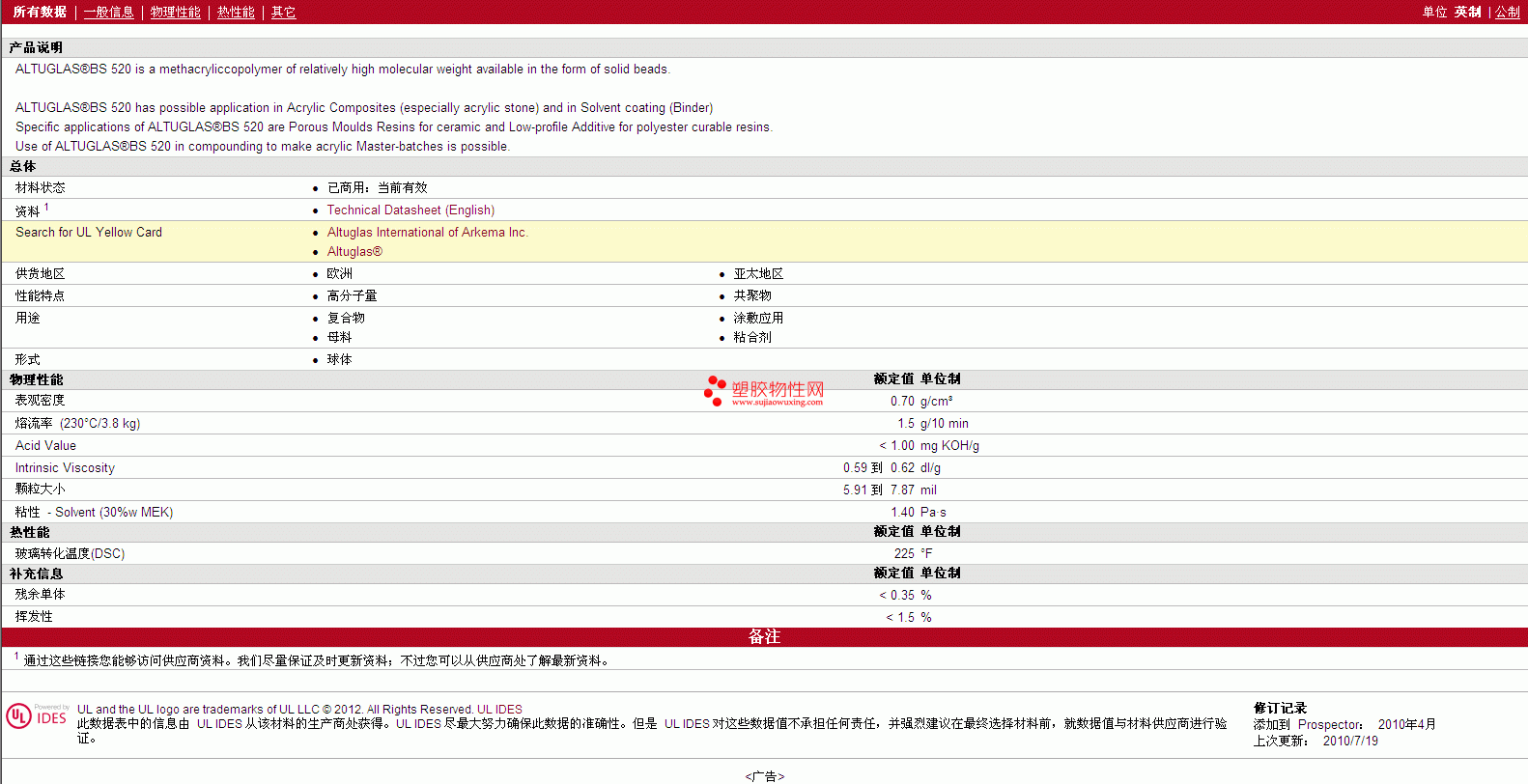 需了解Altuglas PMMA BS 520 物性表更多详情,材质证明、ROHS(SGS)报告、物质安全资料表(MSDS)、UL黄卡等,最新行情报价等可来电咨询:赵先生:13424755533或QQ: 27660005