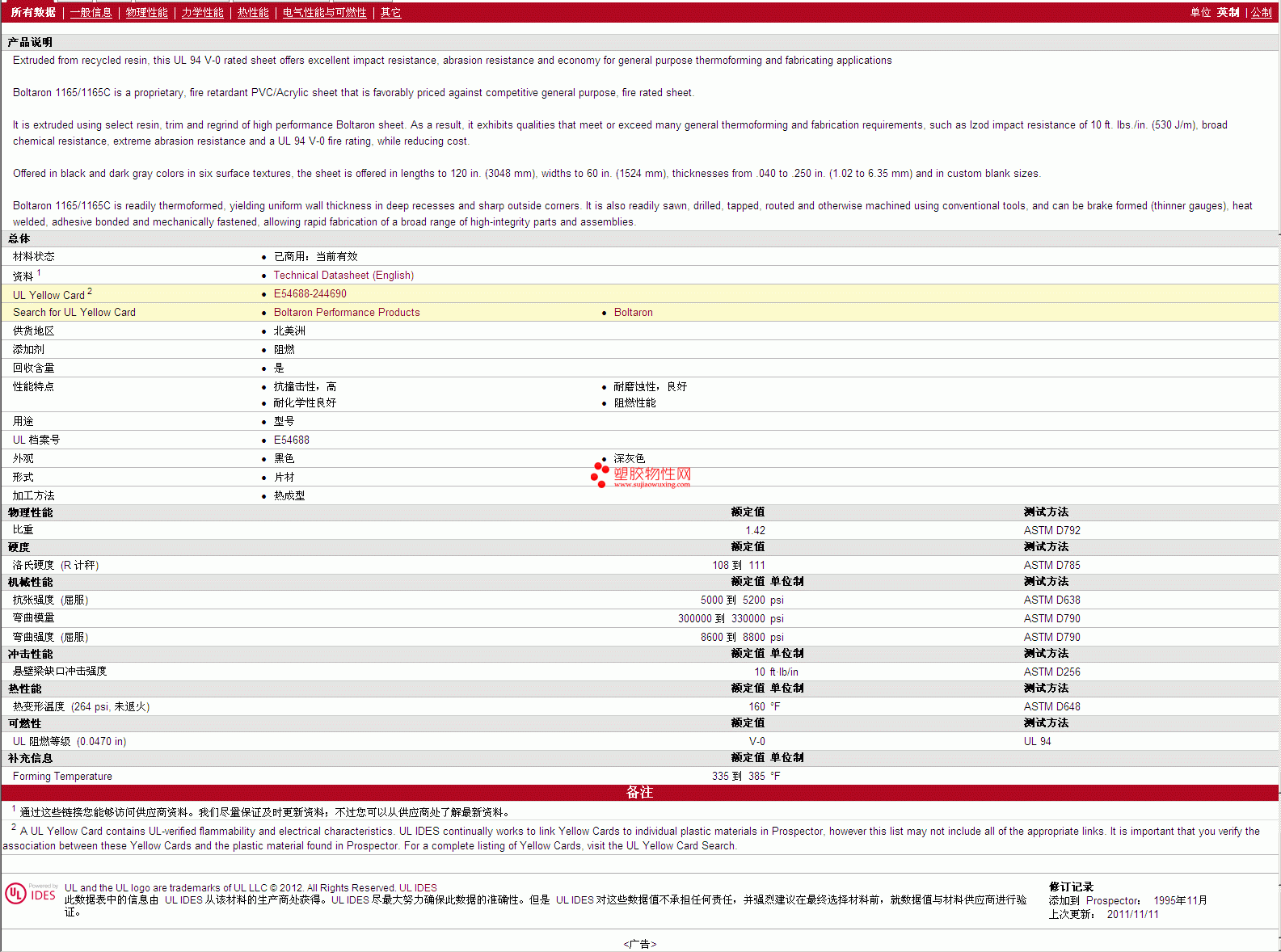 Boltaron PMMA 1165 物性表
