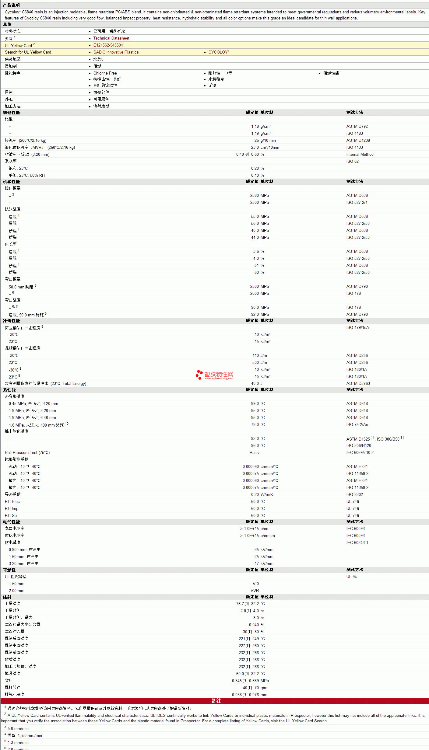 CYCOLOY pc/ABS C6840 Resin物性表更多资料见下图