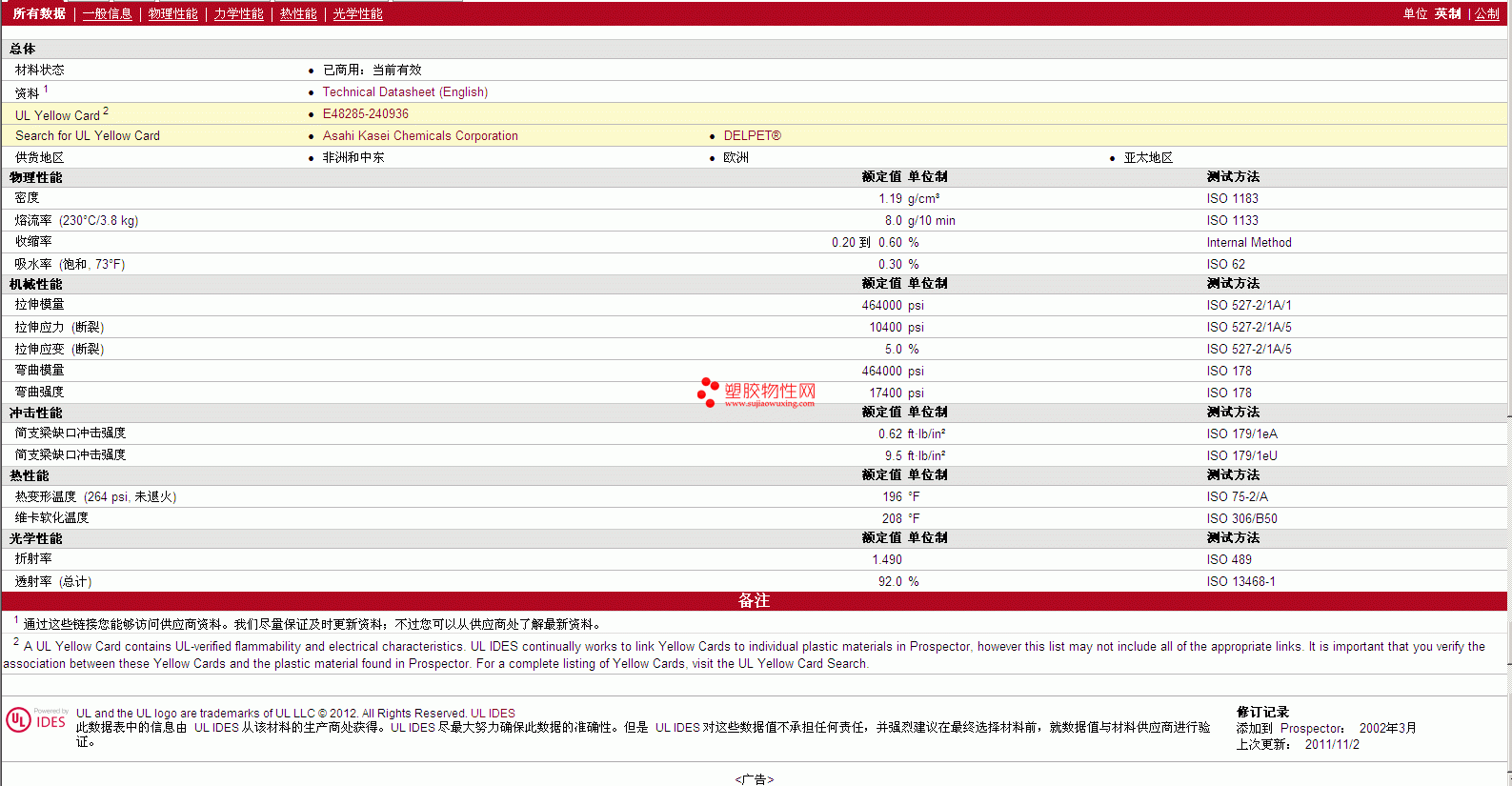 更多DELPET PMMA 60N 物性表报价,图片、材质证明、UL黄卡、物质安全资料表(MSDS)等可来电咨询赵先生:13424755533或QQ: 27660005