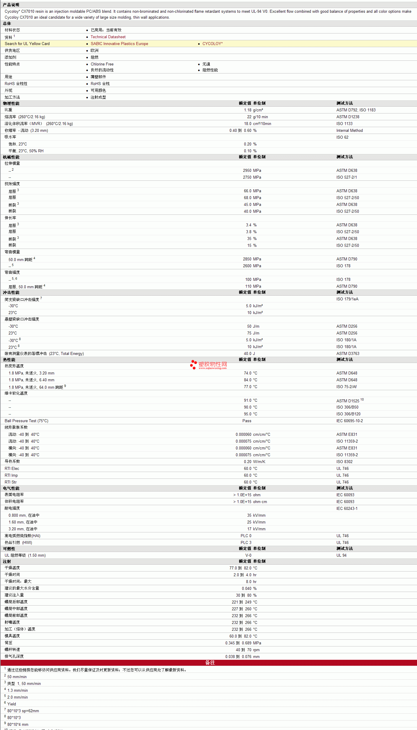 CYCOLOY pc/ABSCX7010 Resin物性表 更多资料见下图
