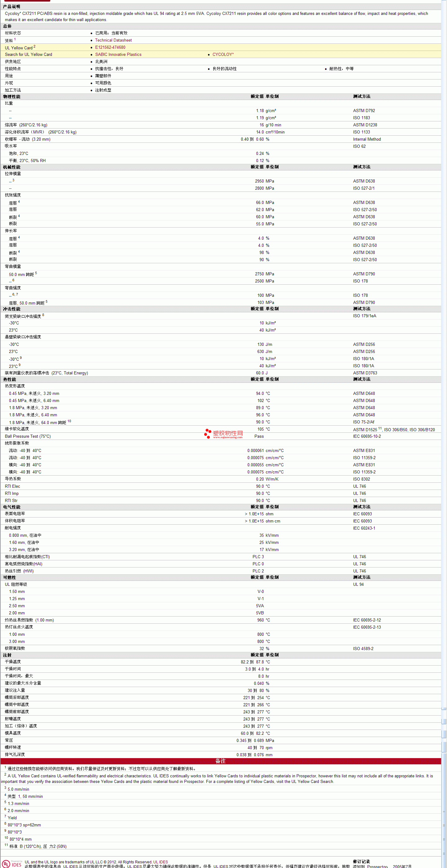 CYCOLOY pc/ABS CX7211 Resin物性表更多资料见下图