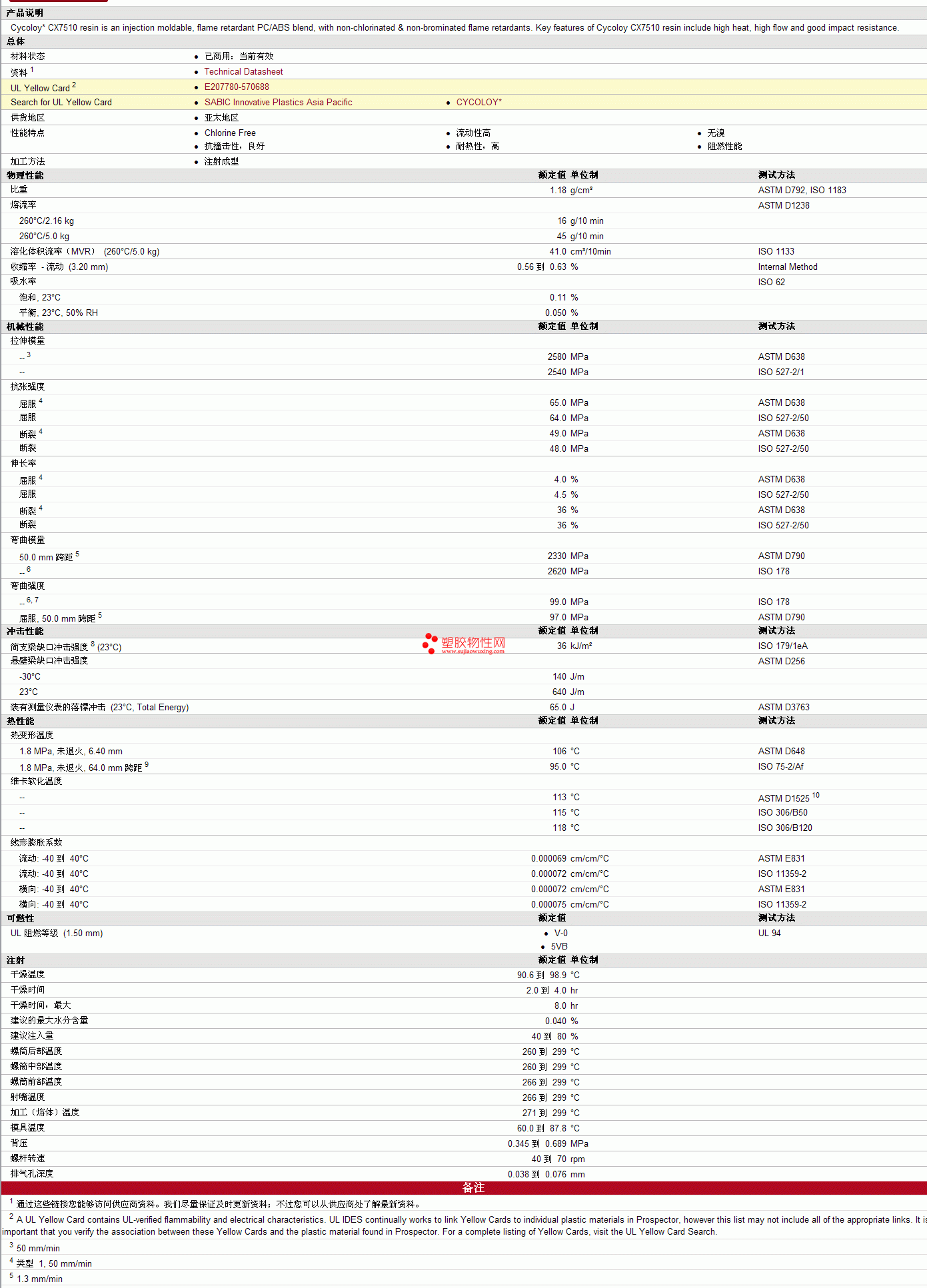 CYCOLOY pc/ABS CX7510 Resin物性表更多资料见下图