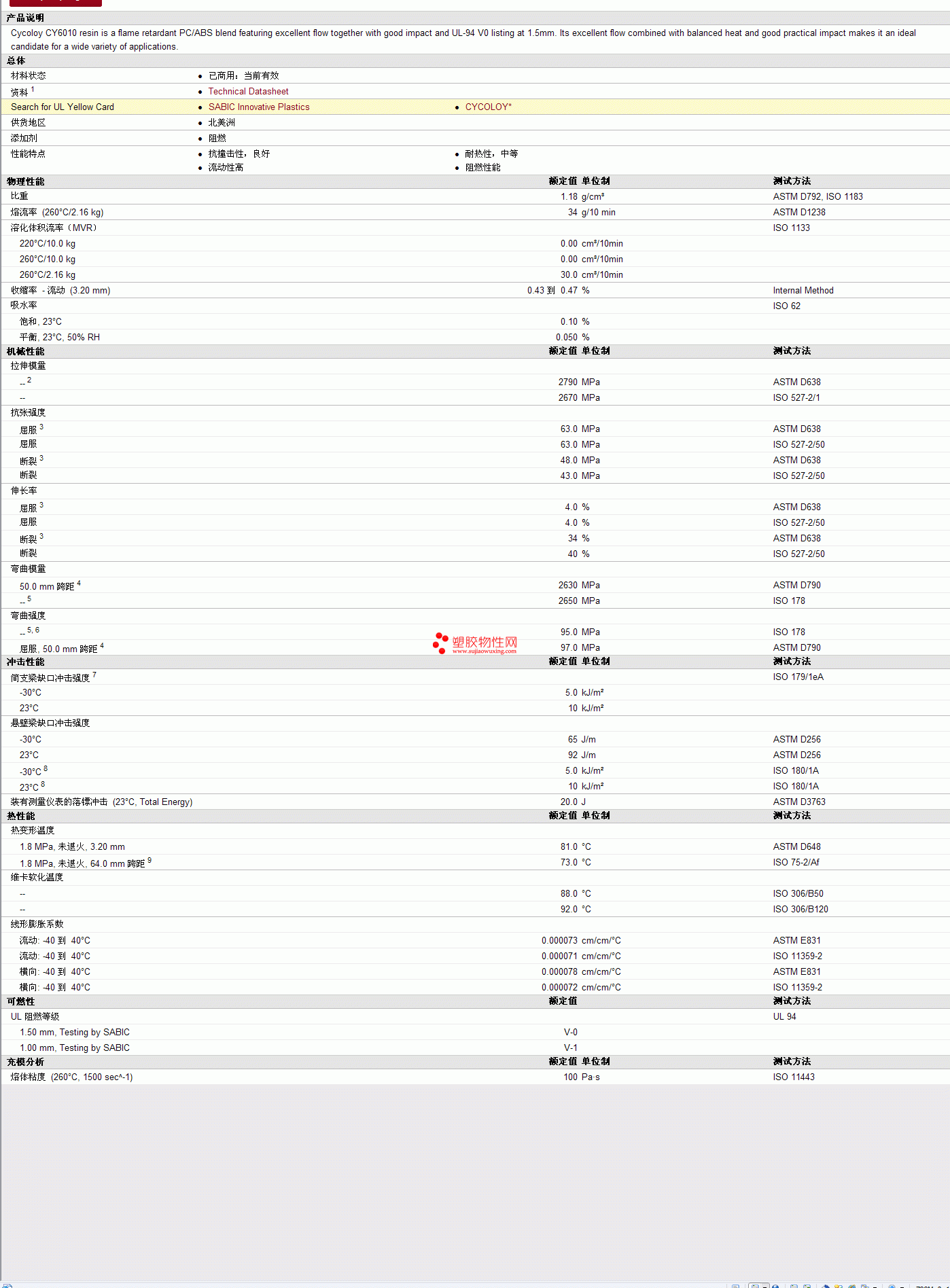 CYCOLOY pc/ABSCY6010 Resin物性表 更多资料见下图