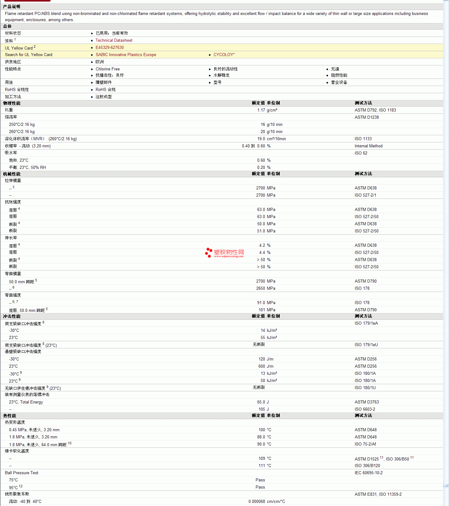 CYCOLOYpc/ABS CY6310 Resin物性表 更多资料见下图