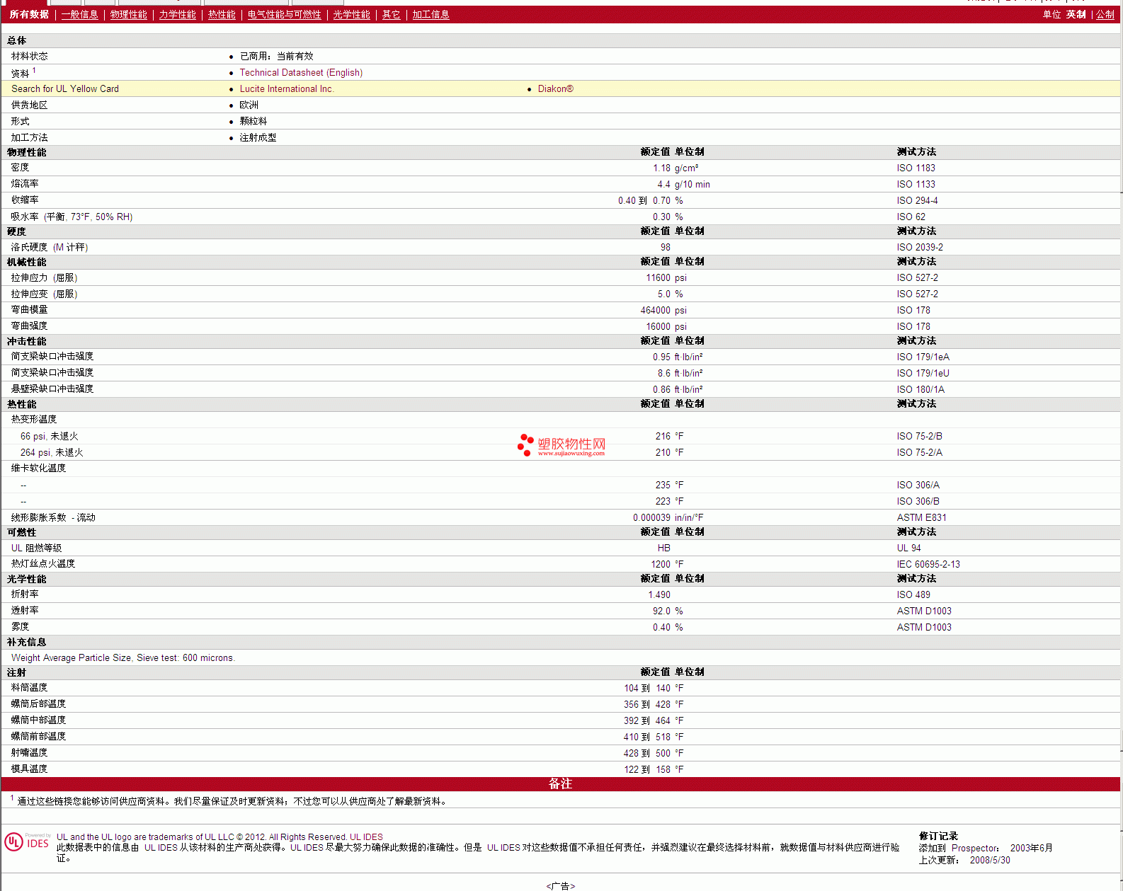 需了解Diakon PMMA MG102 物性表更多详情,材质证明、ROHS(SGS)报告、物质安全资料表(MSDS)、UL黄卡等,最新行情报价等可来电咨询:赵先生:13424755533或QQ: 27660005