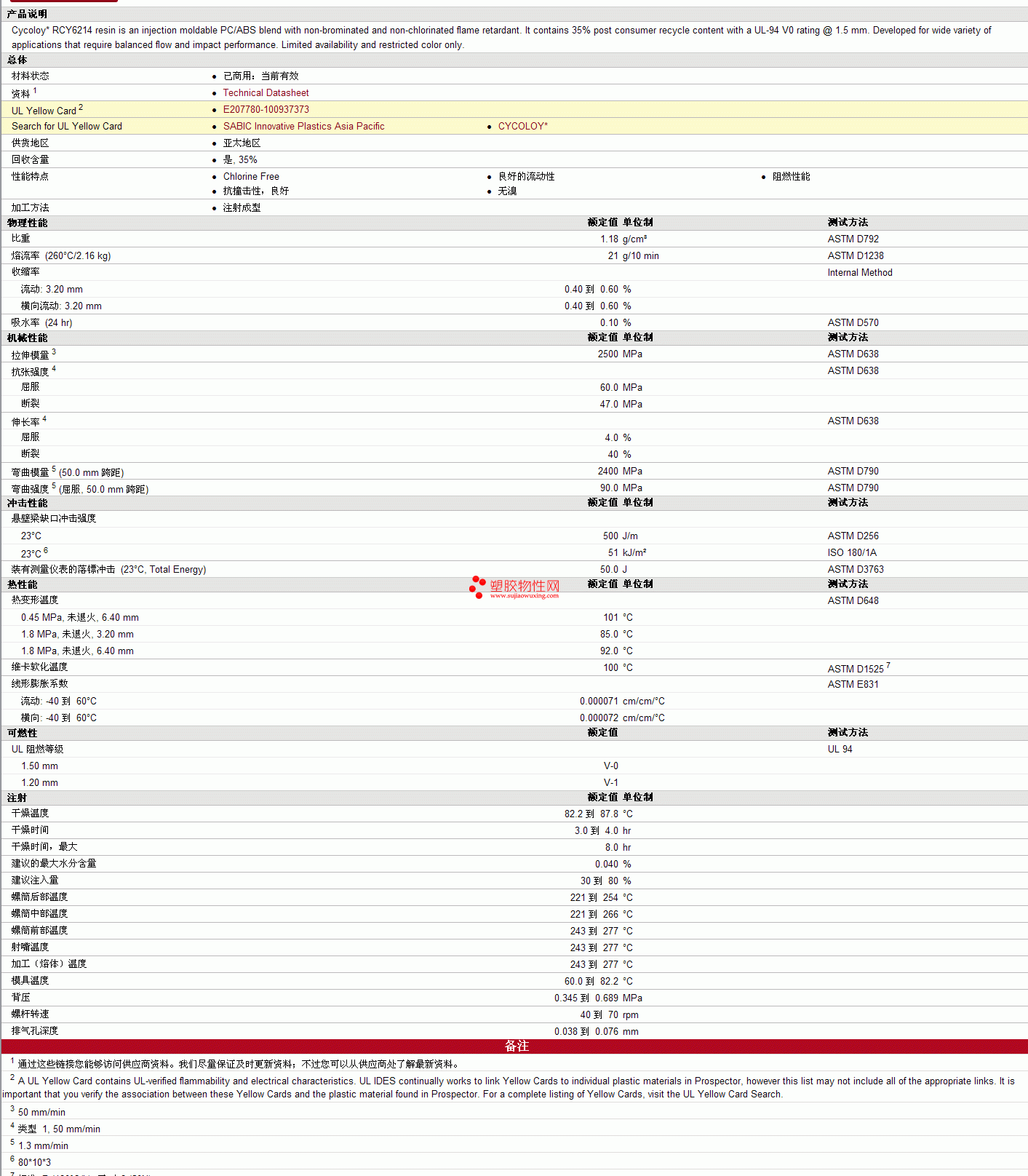 CYCOLOY pc/ABS RCY6214 Resin物性表更多资料见下图