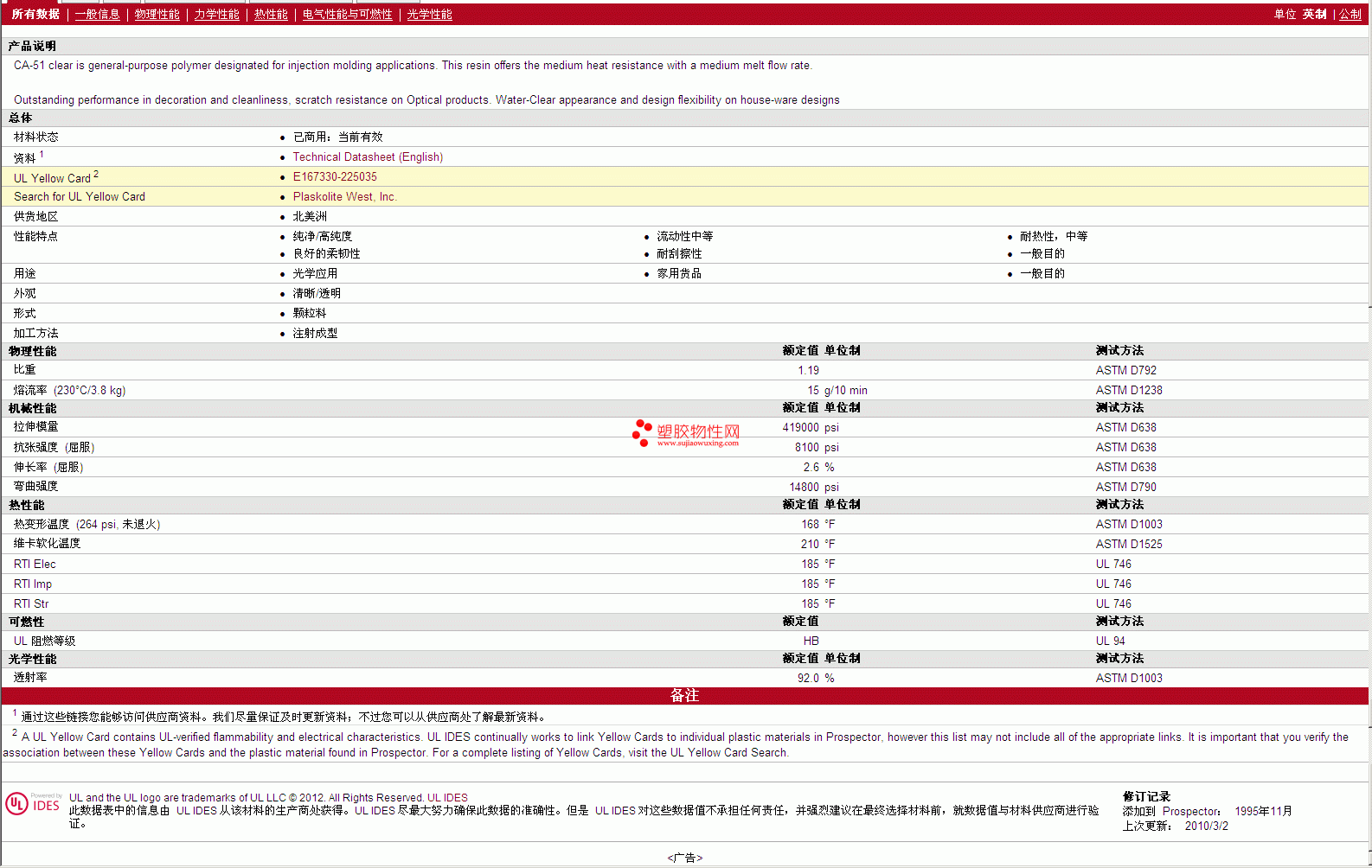 需了解Optix PMMA CA-51 物性表材质证明、ROHS(SGS)报告、物质安全资料表(MSDS)、UL黄卡等可来电咨询:赵先生:13424755533或QQ: 27660005