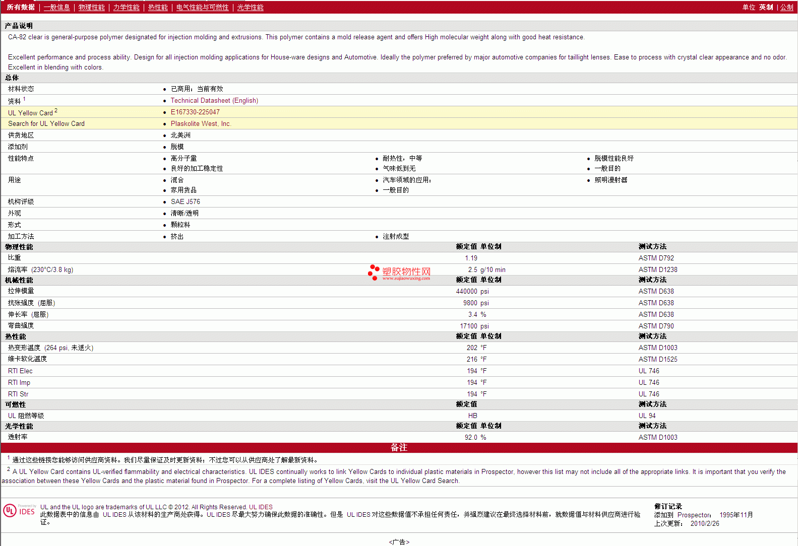 更多Optix PMMA CA-82 物性表报价,图片、材质证明、UL黄卡、物质安全资料表(MSDS)等可来电咨询赵先生:13424755533或QQ: 27660005