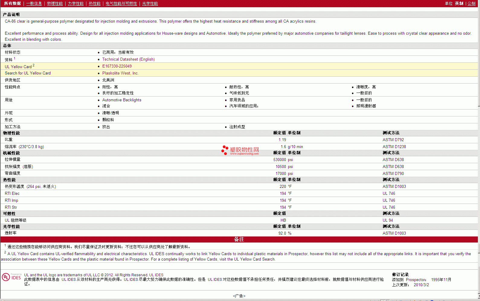 更多 Optix PMMA CA-86 物性表报价,图片、材质证明、UL黄卡、物质安全资料表(MSDS)等可来电咨询赵先生:13424755533或QQ: 27660005