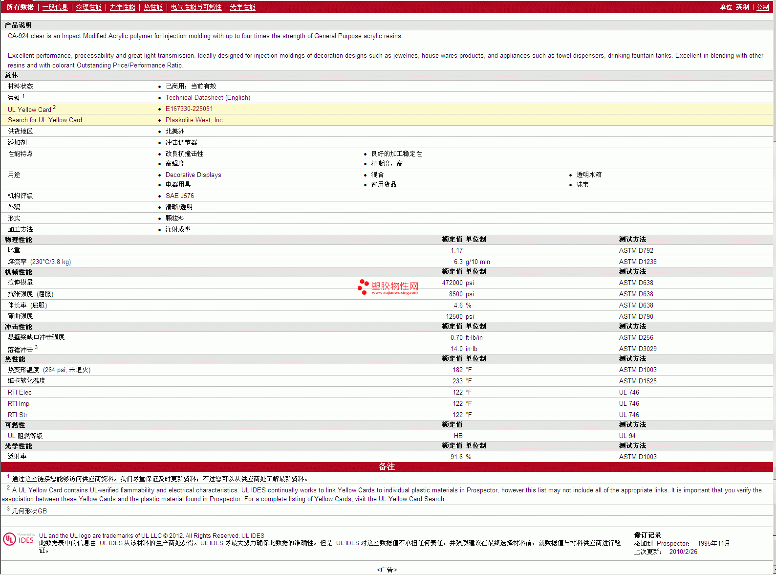更多Optix PMMA CA-924 物性表报价,图片、材质证明、UL黄卡、物质安全资料表(MSDS)等可来电咨询赵先生:13424755533或QQ: 27660005