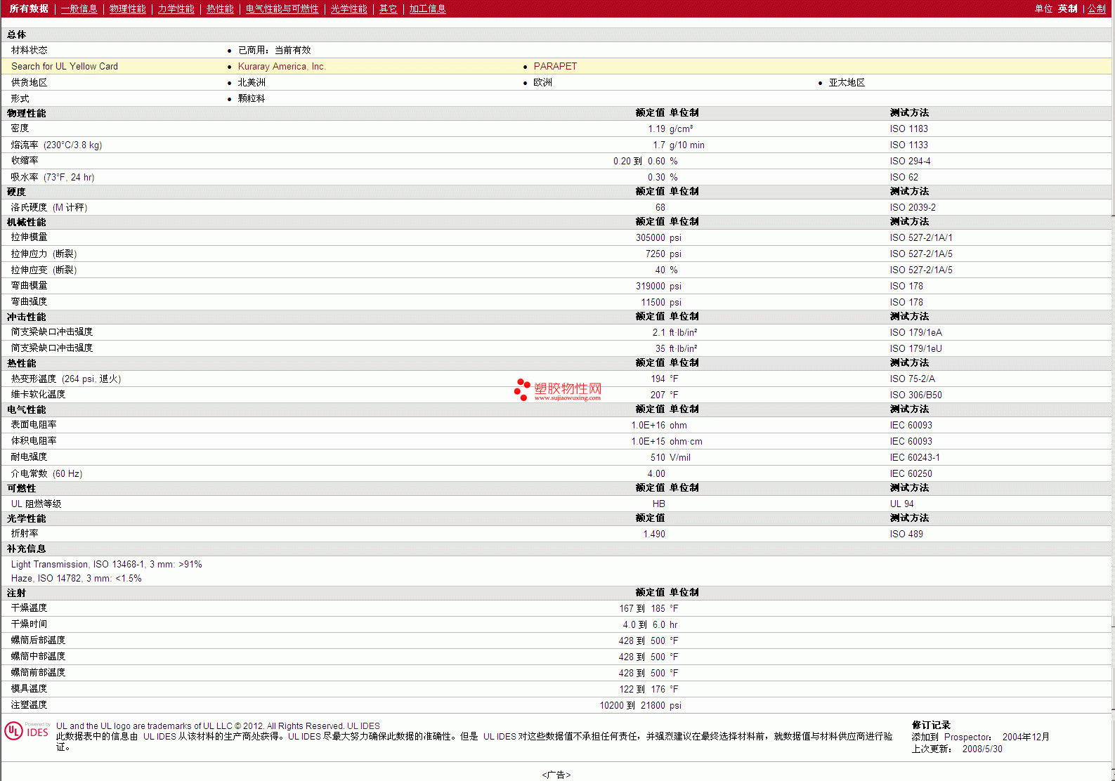 需了解 PARAPET PMMA GR01270 物性表更多详情,材质证明、ROHS(SGS)报告、物质安全资料表(MSDS)、UL黄卡等,最新行情报价等可来电咨询:赵先生:13424755533或QQ: 27660005