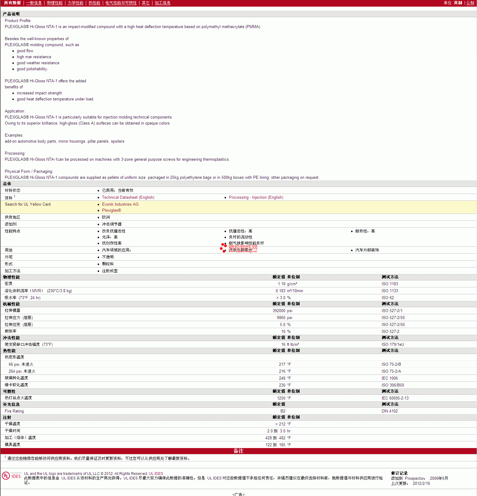 需了解Plexiglas PMMA NTA-1 物性表材质证明、ROHS(SGS)报告、物质安全资料表(MSDS)、UL黄卡等可来电咨询:赵先生:13424755533或QQ: 27660005
