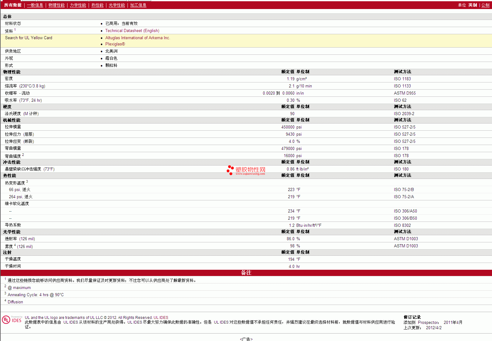 需了解Plexiglas PMMA V825-68177 物性表更多详情,材质证明、ROHS(SGS)报告、物质安全资料表(MSDS)、UL黄卡等,最新行情报价等可来电咨询:赵先生:13424755533或QQ: 27660005