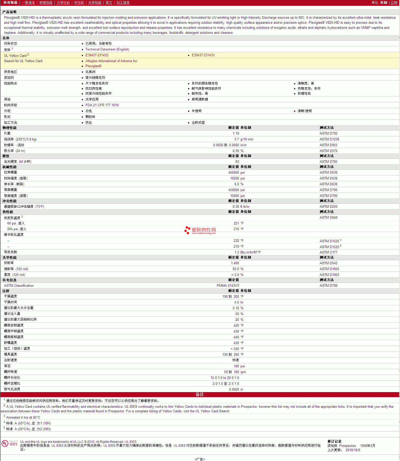 更多Plexiglas PMMA V825-HID 物性表报价,图片、材质证明、UL黄卡、物质安全资料表(MSDS)等可来电咨询赵先生:13424755533或QQ: 27660005