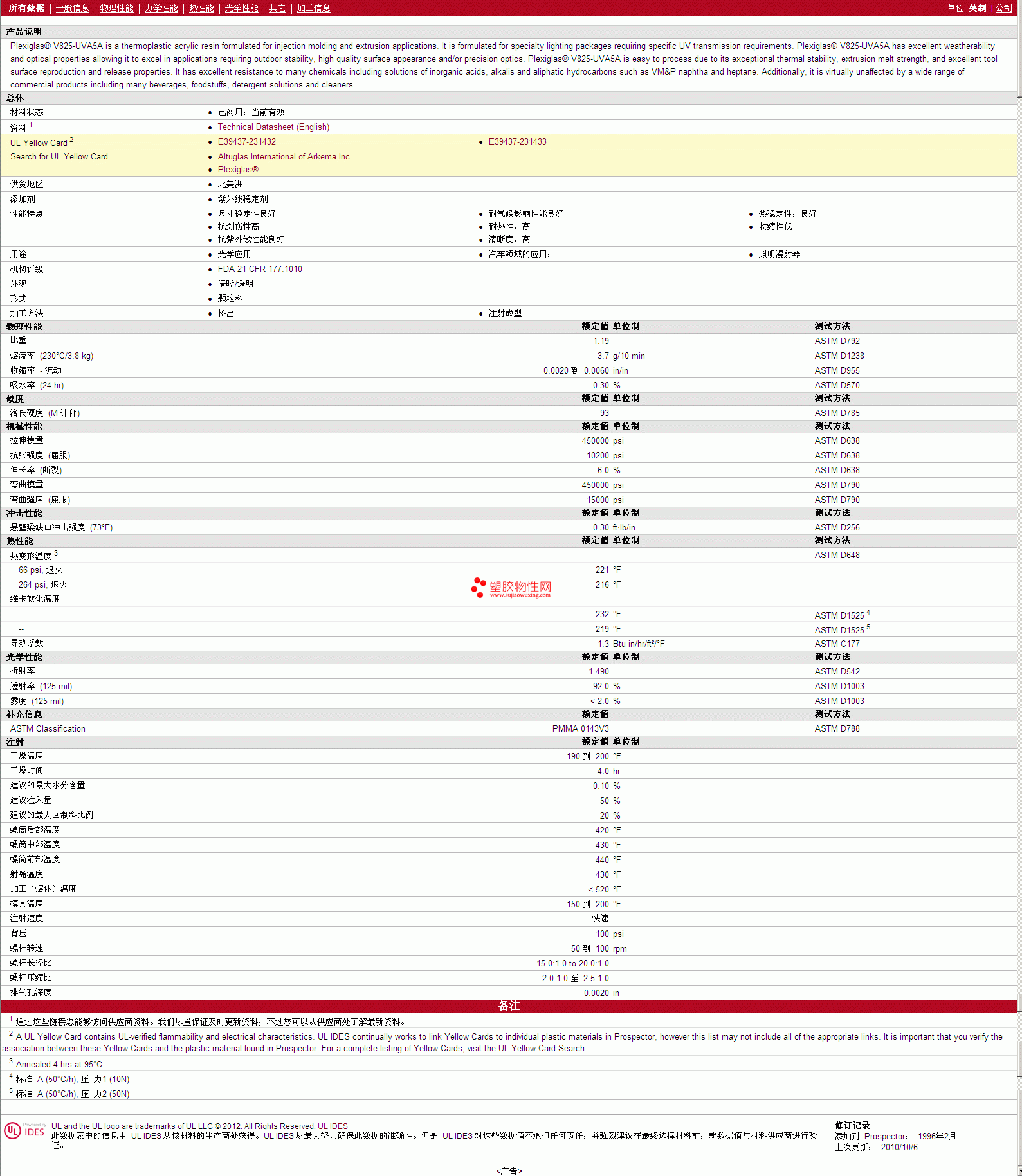 Plexiglas PMMA V825-UVA5A 物性表