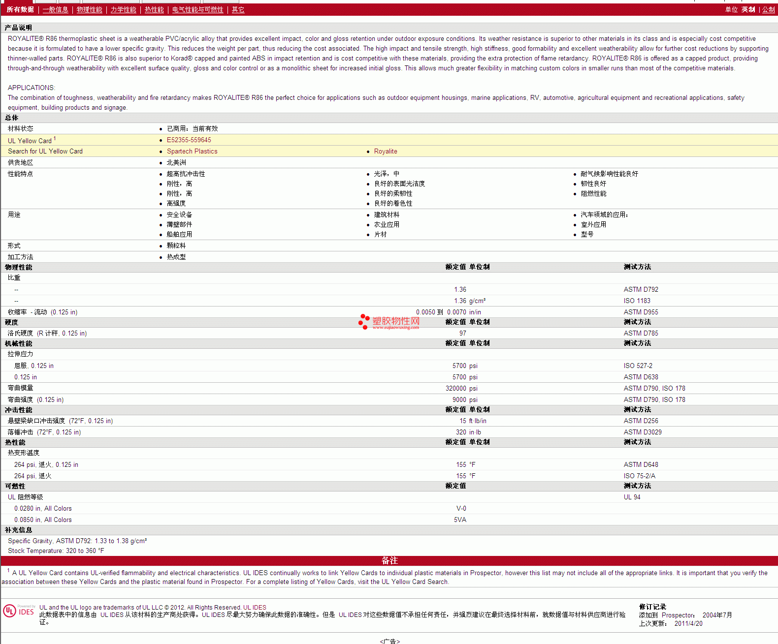 更多Royalite PMMA R86 物性表报价,图片、材质证明、UL黄卡、物质安全资料表(MSDS)等可来电咨询赵先生:13424755533或QQ: 27660005