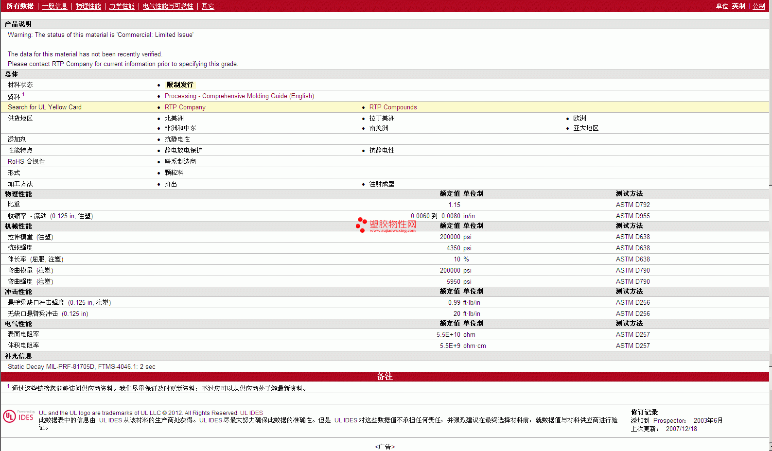 RTP Compounds PMMA 1800 EG 详细情况如图