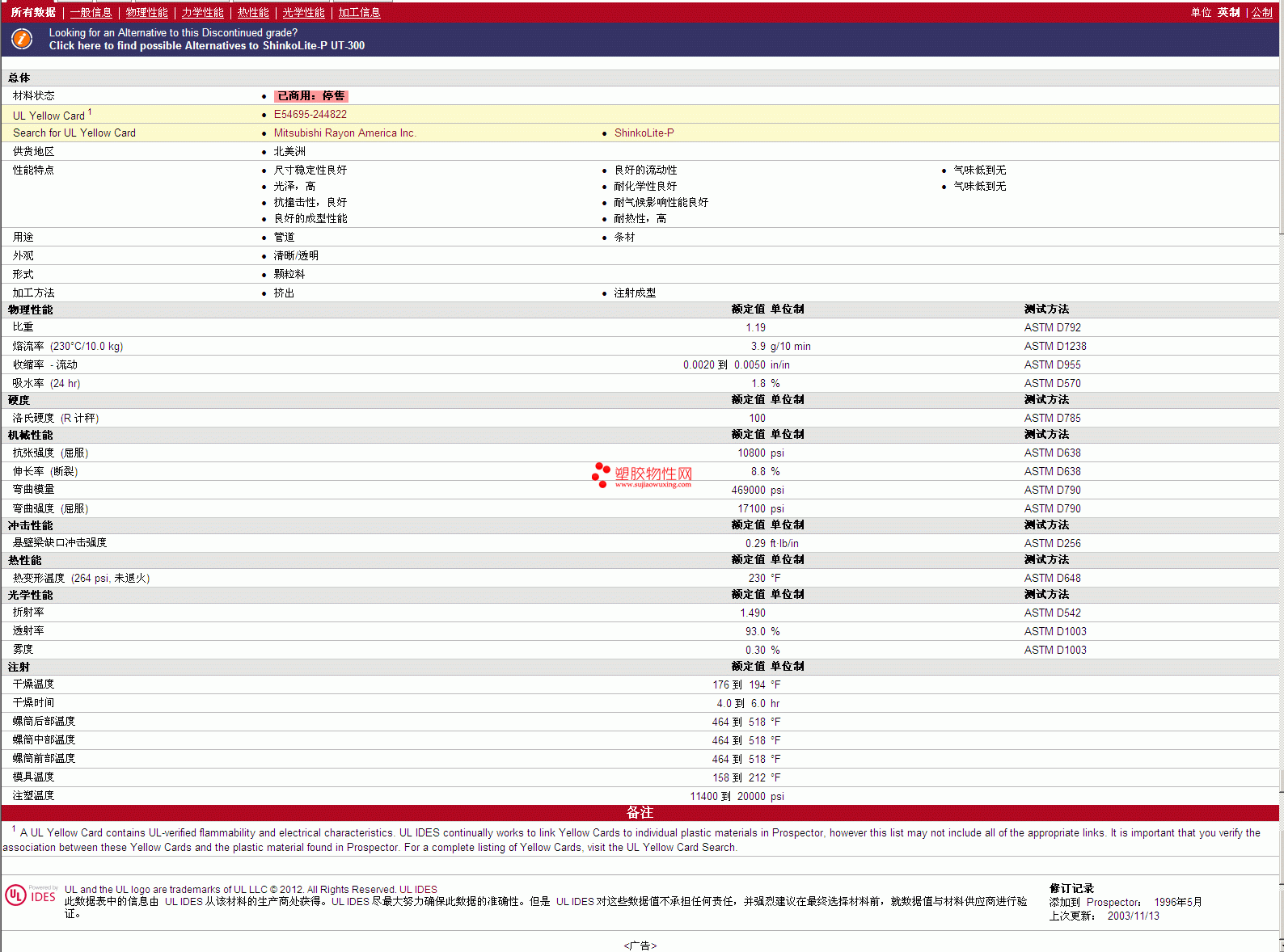 更多 ShinkoLite-P PMMA UT-300 物性表图片,报价、物质安全资料表(MSDS)、材质证明、UL黄卡等,最新行情报价等可来电咨询赵先生:13424755533或QQ: 27660005