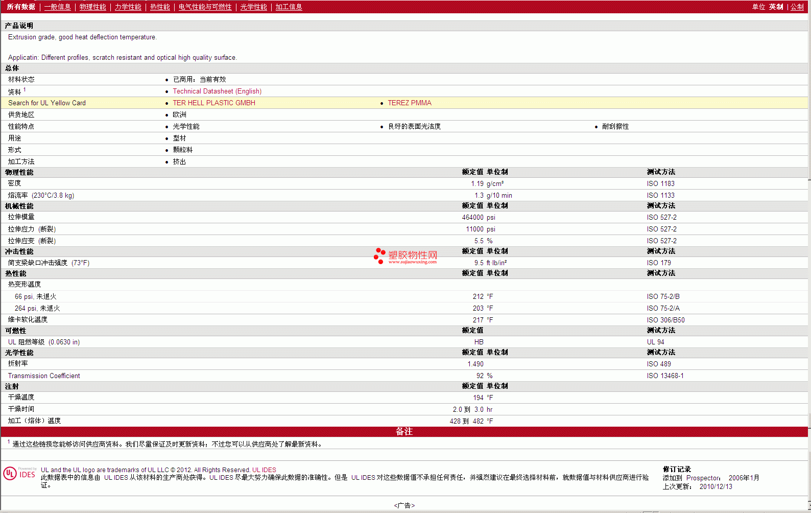 更多TEREZ PMMA 5002 E 物性表报价,图片、材质证明、UL黄卡、物质安全资料表(MSDS)等可来电咨询赵先生:13424755533或QQ: 27660005