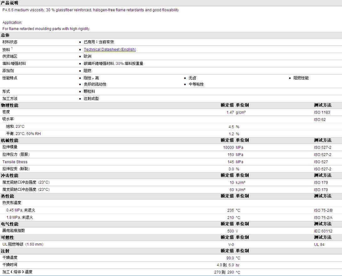TEREZ PA66 7500 GF30 FL HF /2物性表资料详细内容如图