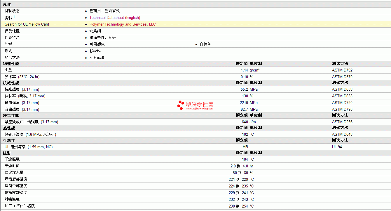 | 弯曲模量 (3.17 mm) | 2210 | MPa | ASTM D790 |