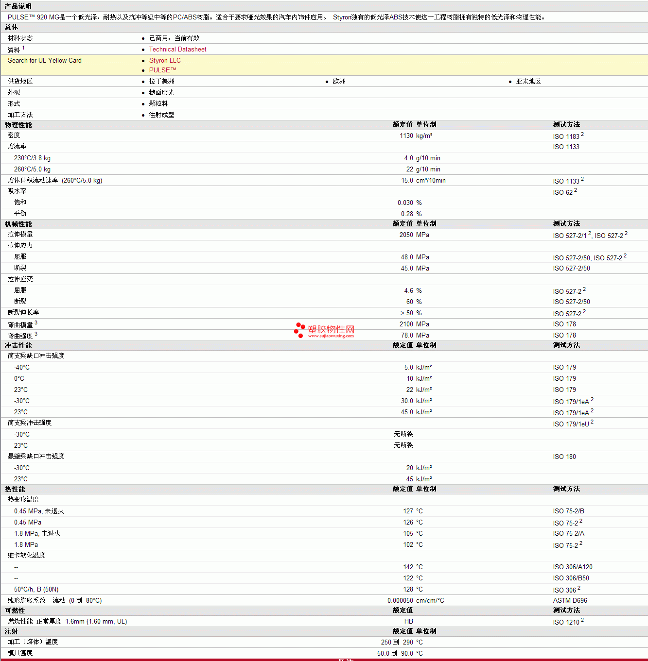 PULSE pc/ABS920 MG物性表更多资料见下图