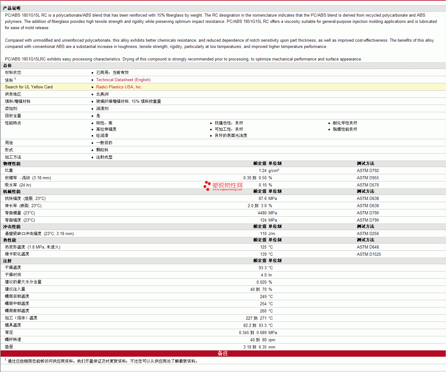 Radici Compounds PC/ABS 1851G15L RC物性表 更多资料见下图
