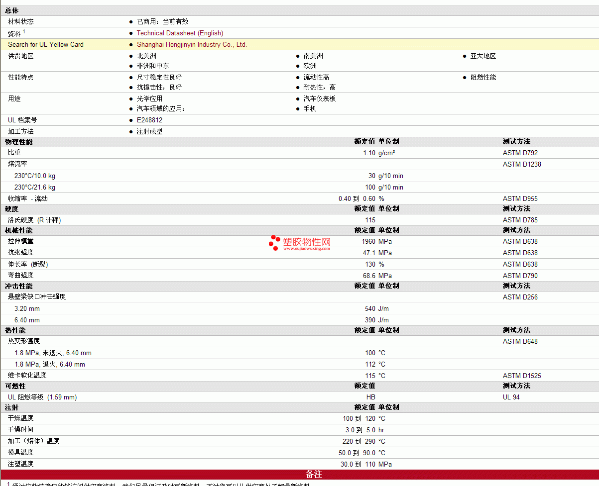 其他工程塑料物性表