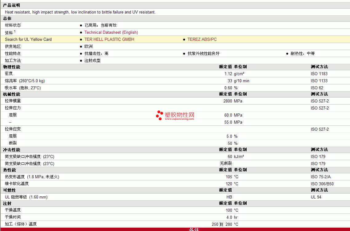 TEREZ ABS/PC Blend 2000 UV 物性表 见图片