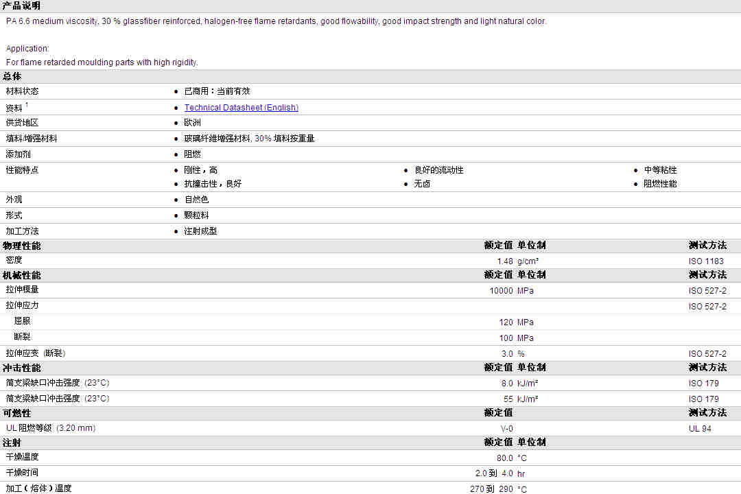TEREZ PA66 7500 GF 30 FL HF /3物性表资料详细内容如图