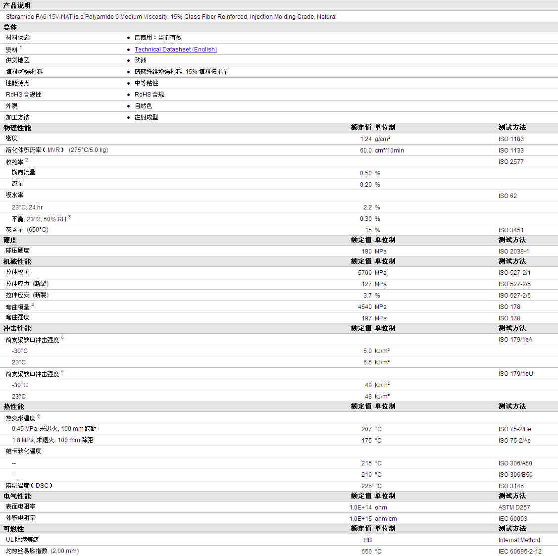如需了解Staramide PA6-15V-NAT物性表更多详情pdf文档资料,最新行情报价,物质安全资料表(MSDS)、材质证明、UL黄卡等可来电咨询:袁小姐13266047972 QQ:767320520
