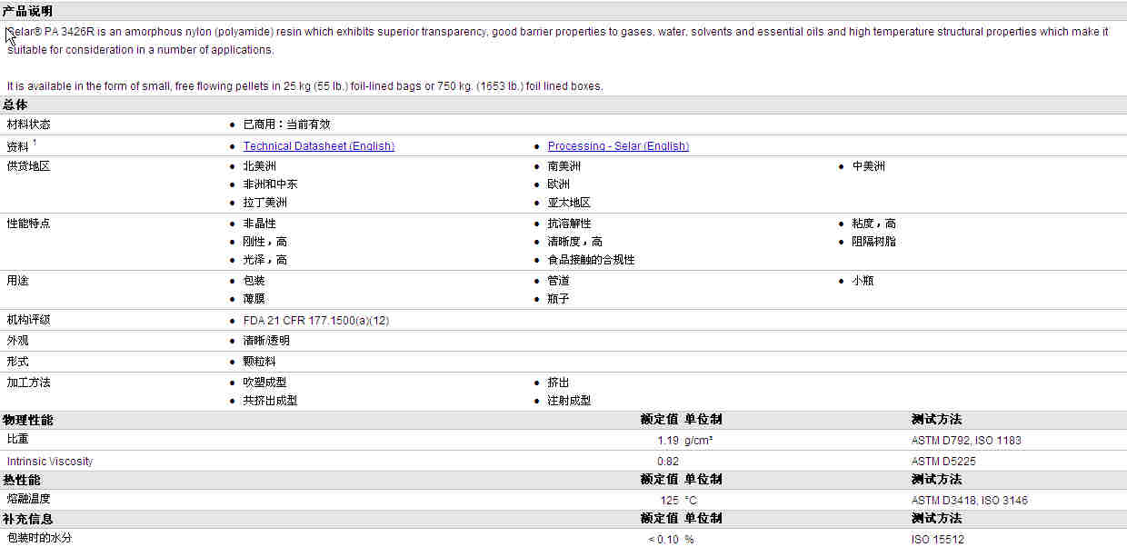 Selar® PA 3426R物性表资料详情见图