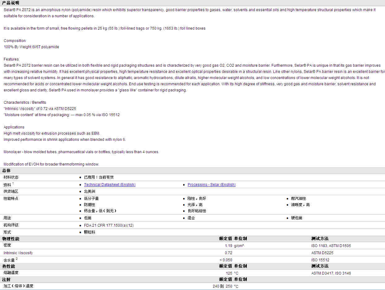 Selar® PA 2072物性表资料详情见图