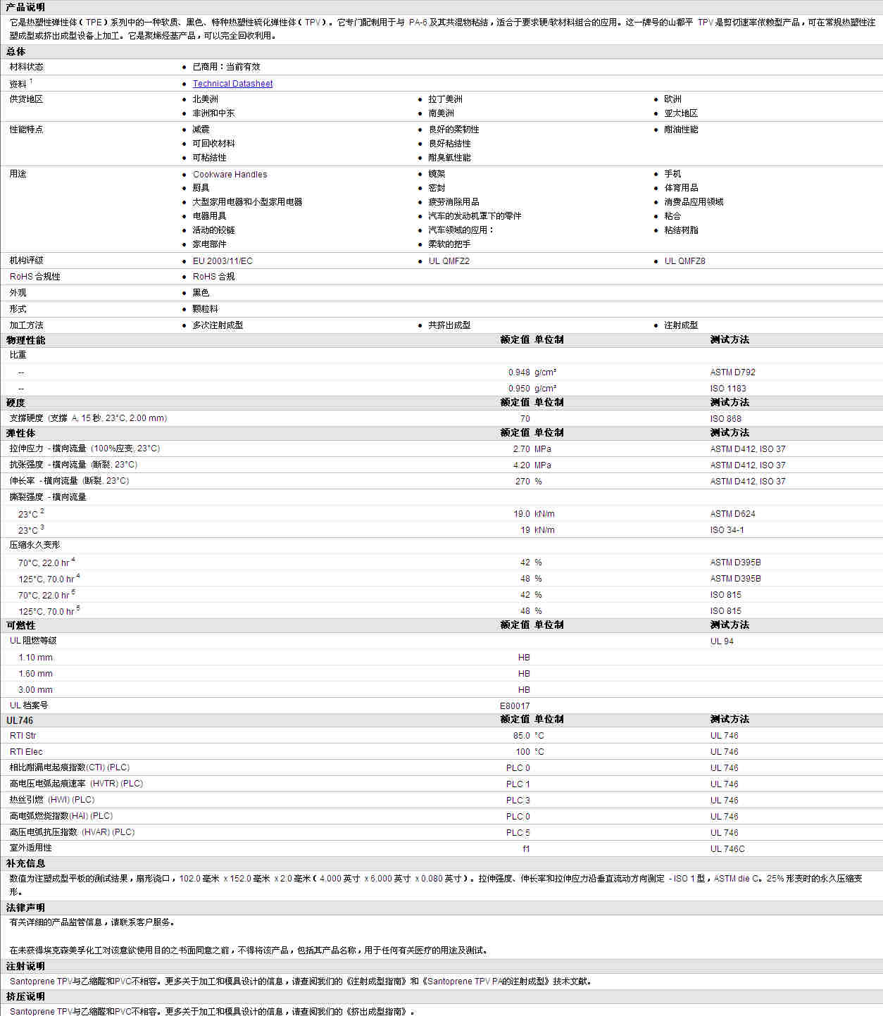 如需了解SantopreneTPV 191-70PA 物性表更多详情pdf文档资料,最新行情报价,物质安全资料表(MSDS)、材质证明、UL黄卡等可来电咨询:袁小姐13266047972 QQ:767320520
