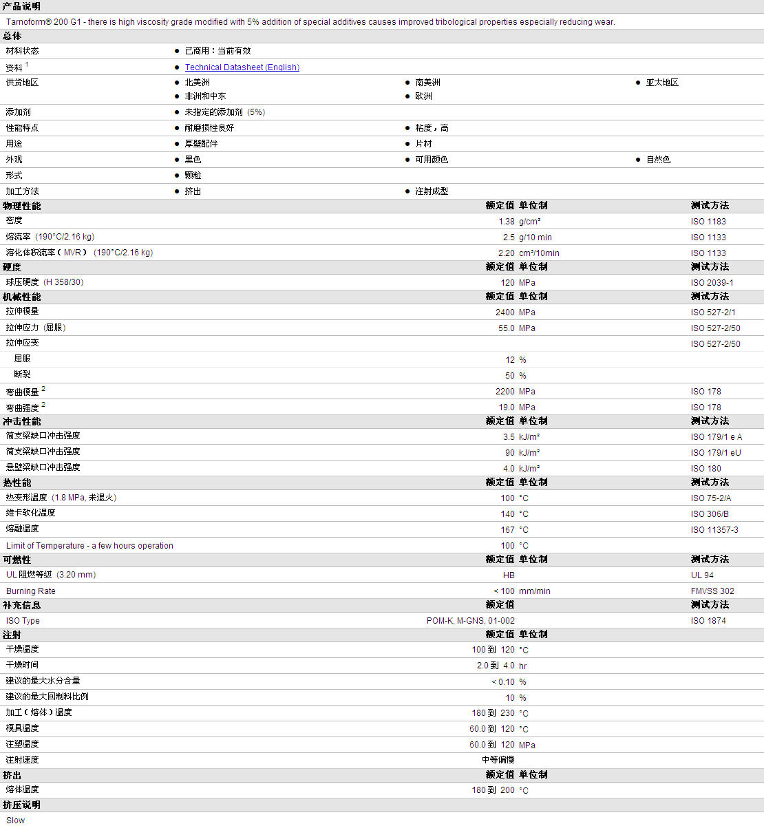 | 溶化体积流率(MVR) (190°C/2.16 kg) | 2.20 | cm³/10min | ISO 1133 |
