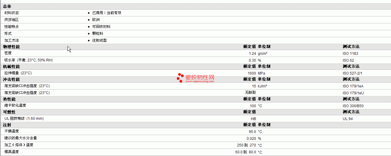 | 拉伸模量 (23°C) | 1600 | MPa | ISO 527-2/1 |