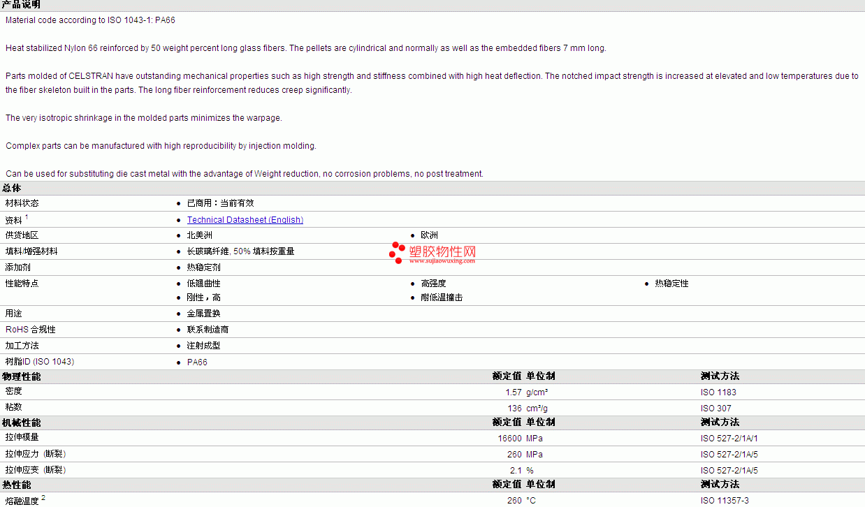 Celstran PA66 GF50-02 P7 物性表详情如图所示