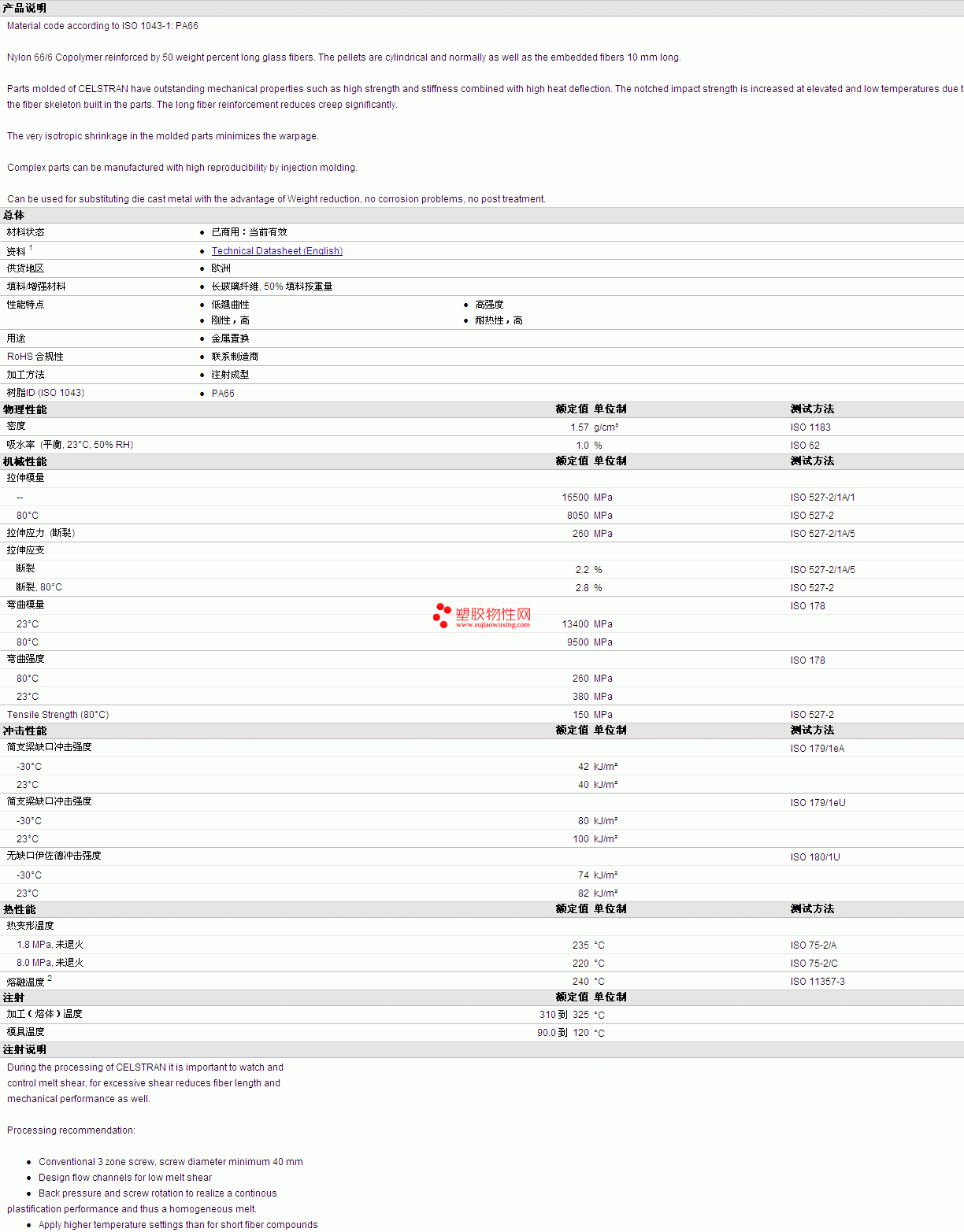 Celstran PA66-GF50-0111P10/11物性表详细情况如图