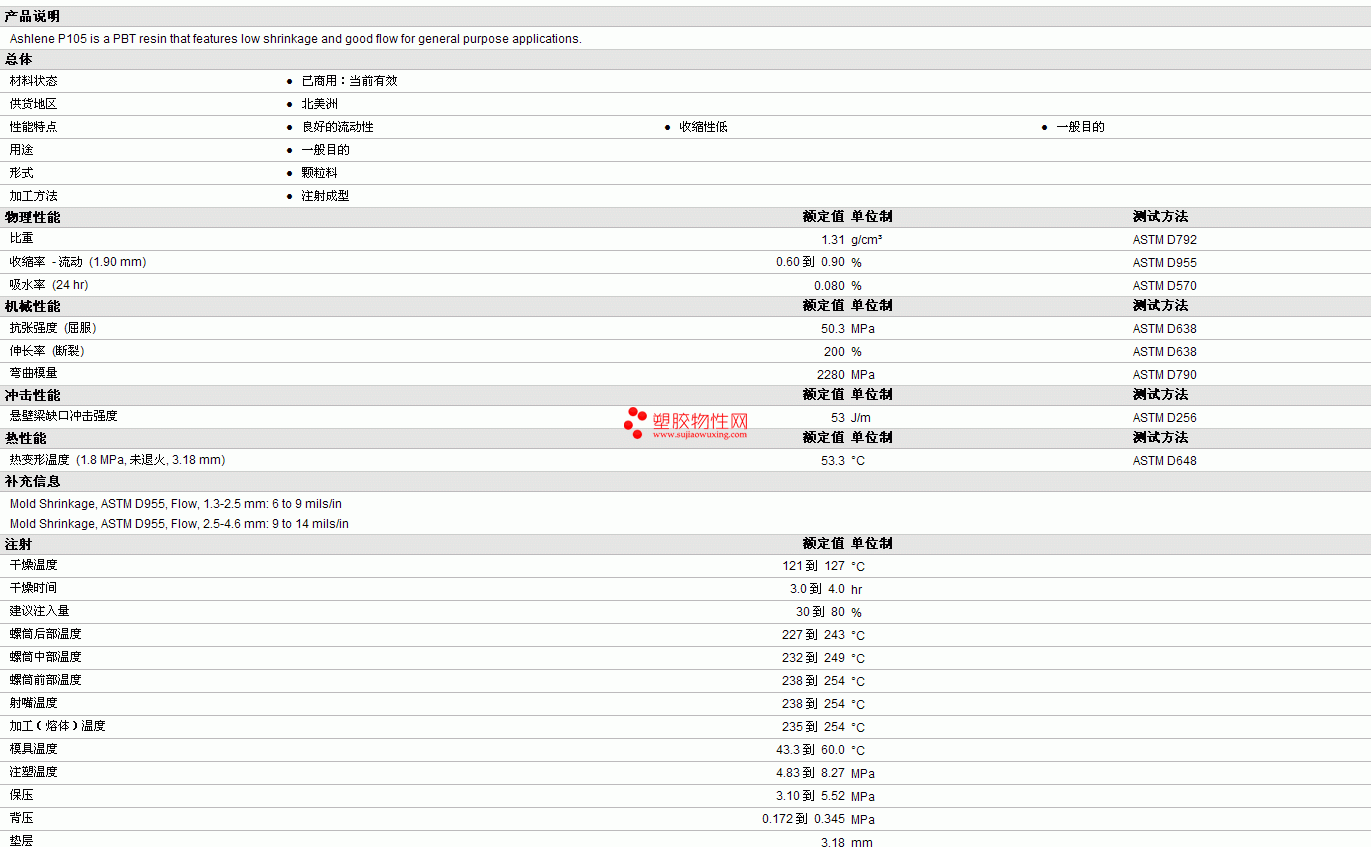 ASHLENE pbt P105物性表更多资料见下图