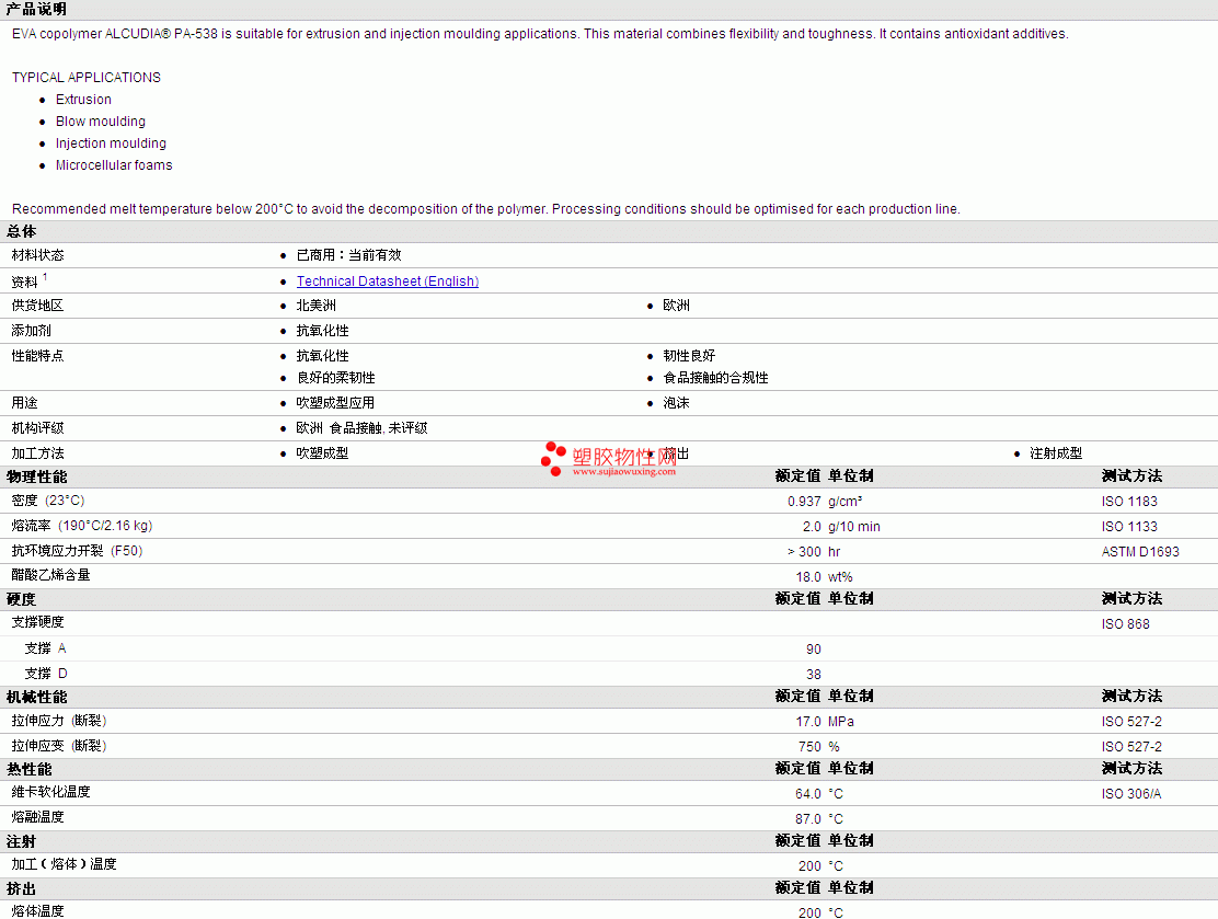 如需了解ALCUDIA PA-EVA 538物性表更多详情,物质安全资料表(MSDS)、材质证明、UL黄卡等,最新行情报价等可来电咨询或QQ:767320520